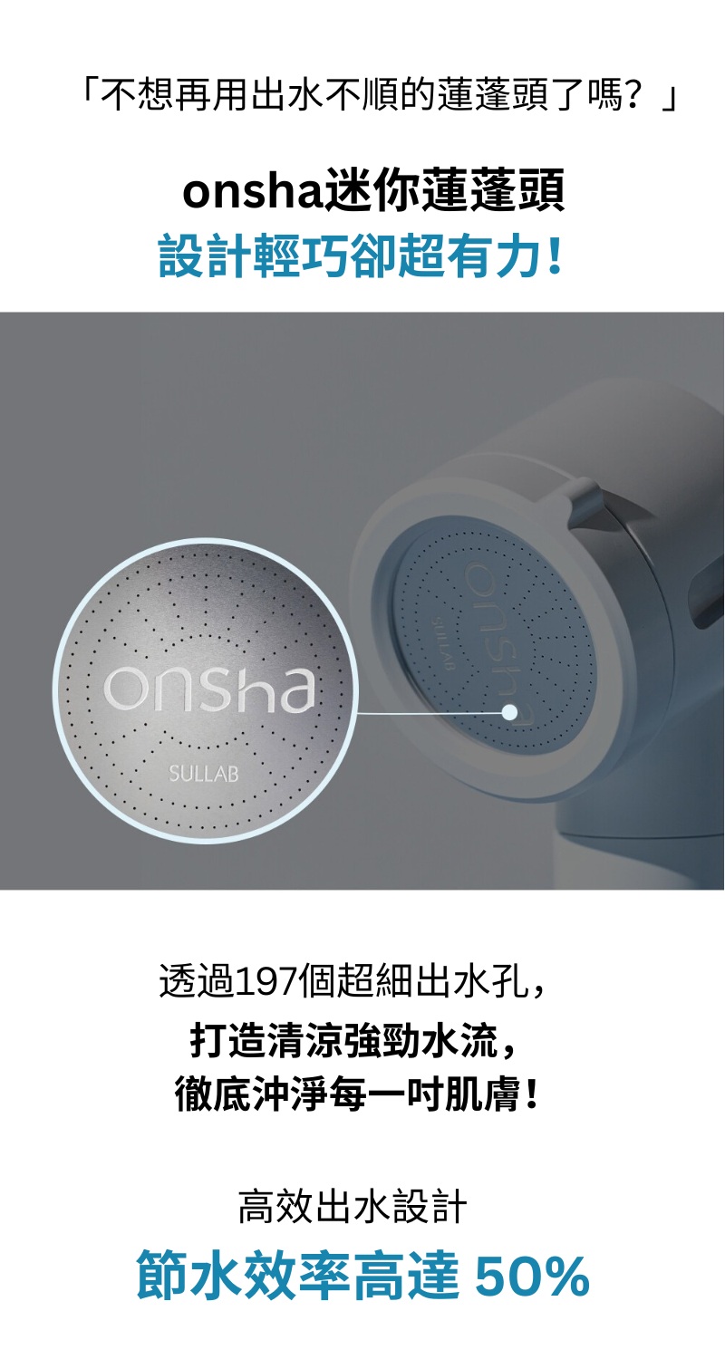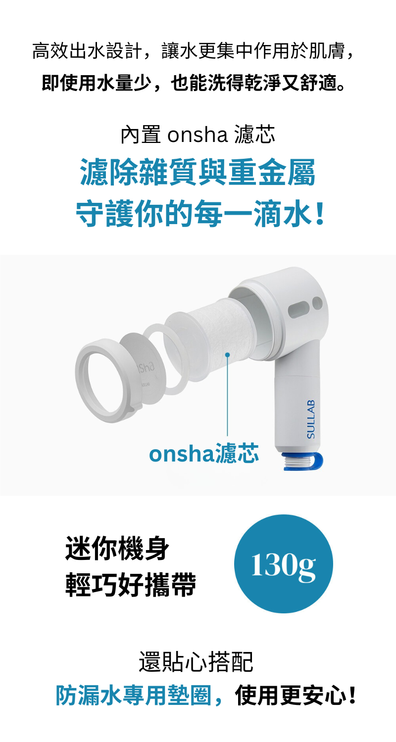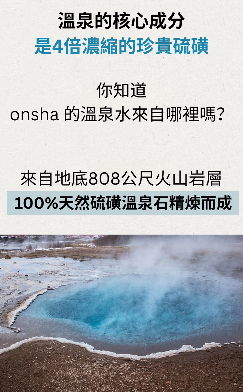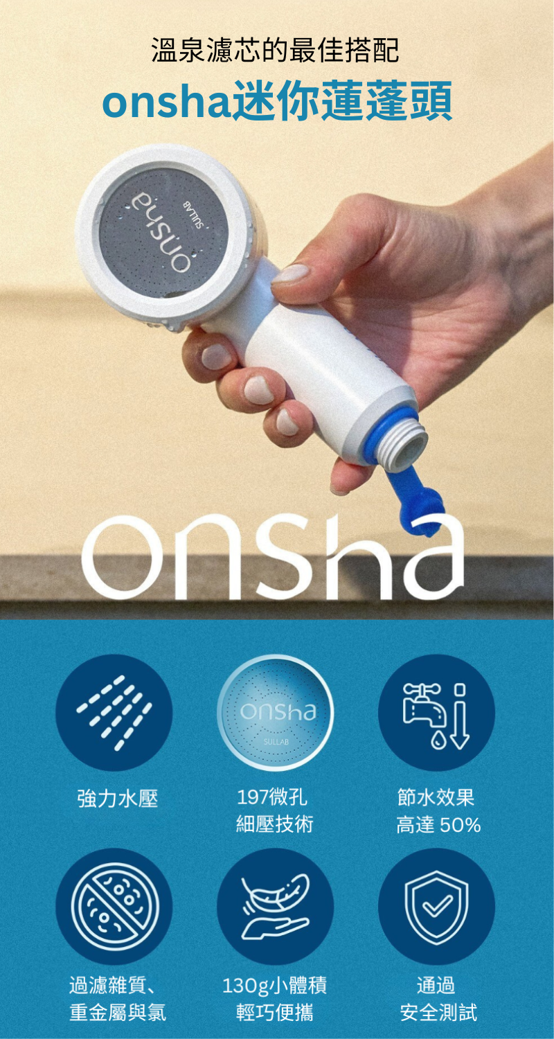 ONSHA 將冷凍乾燥的天然溫泉水製成高濃縮凝膠濾芯,安裝於蓮蓬頭底部