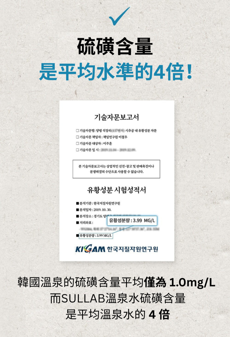 使用從地底808公尺花崗岩層抽取的100%天然硫磺溫泉水