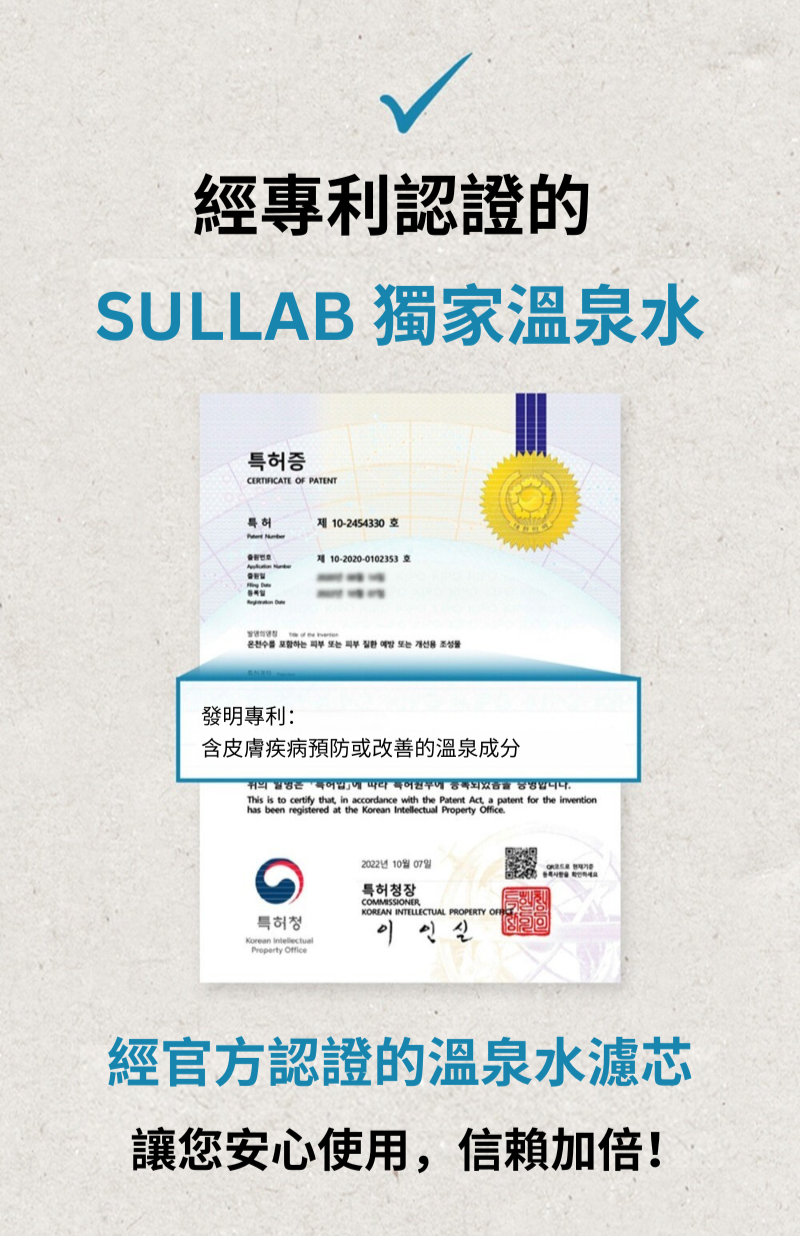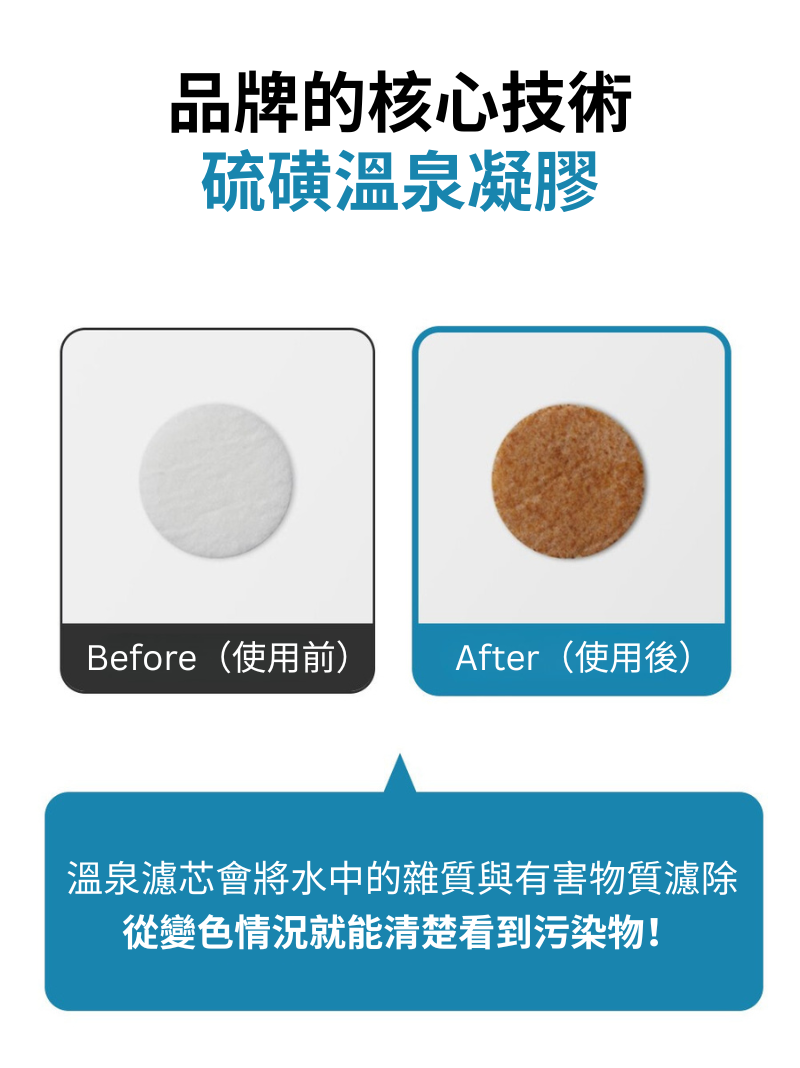 我們開發出創新溫泉濾芯,將韓國天然硫磺溫泉水冷凍乾燥後製成濾芯。當水流經濾芯時,透過蓮蓬頭即可釋放如同溫泉水般的洗浴體驗。