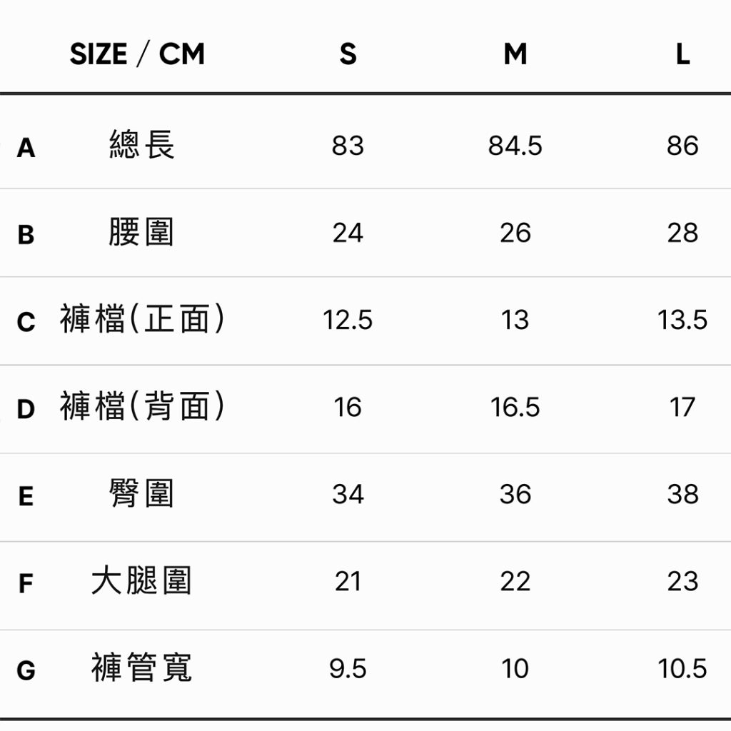 S: 總長 83 / 腰圍 24 / 褲檔(正面) 12.5 / 褲檔(背面) 16 / 臀圍 34 / 大腿圍 21 / 褲管寬 9.5