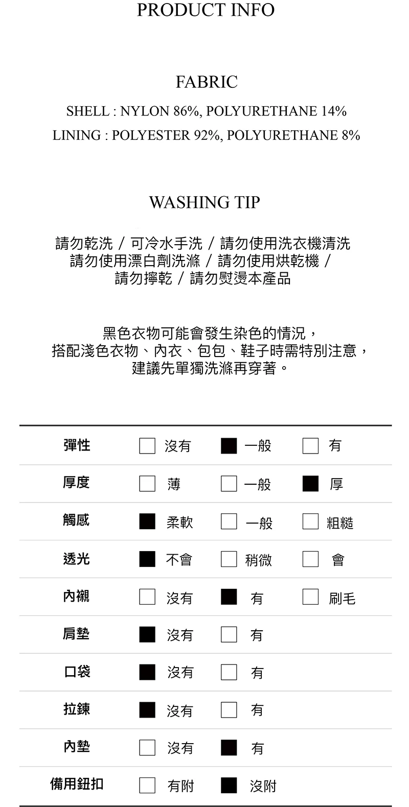 內層材質: 92% 聚酯纖維、8% 聚氨酯