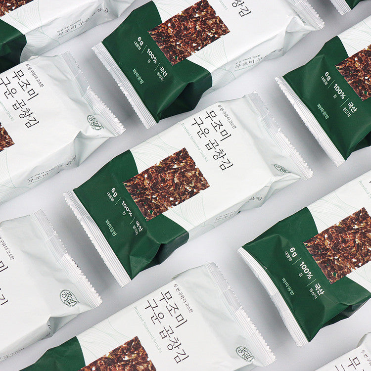 混合少量(20%)以傳統方式養殖的再來海苔,平衡大腸海苔的粗糙質地,達到最佳酥脆口感。